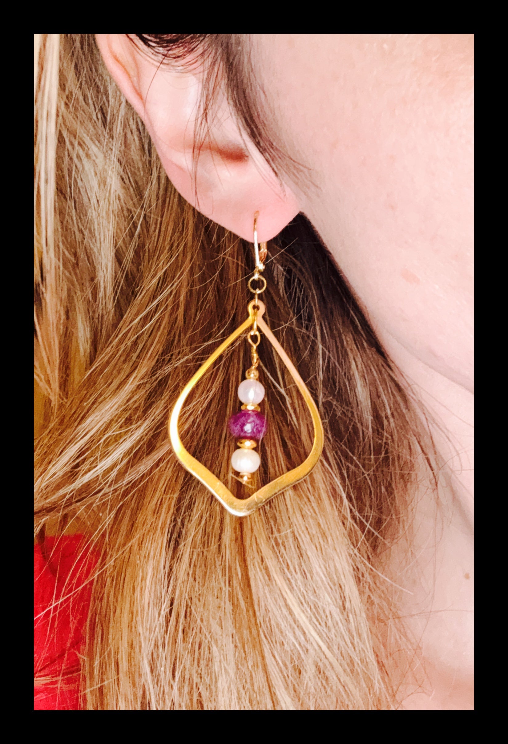 Featuring lustrous pearls and captivating alexandrite, each gem is set within a golden metal teardrop frame adorned with 18K gold plated spacers.