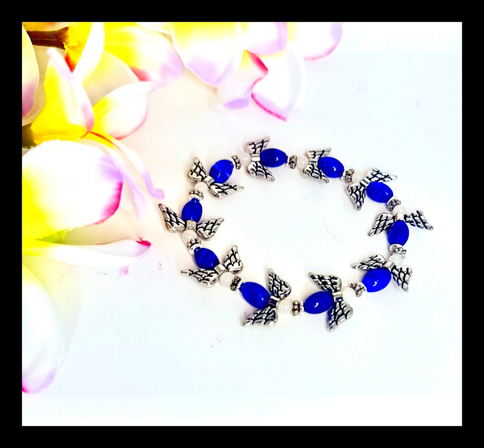 This bracelet features an exquisite combination of materials, including serene white jade beads, vibrant blue dyed glass beads, and radiant silver spacers. The silver accents elegantly complement the overall design, transforming this assortment of materials into a circle of guardian angels.