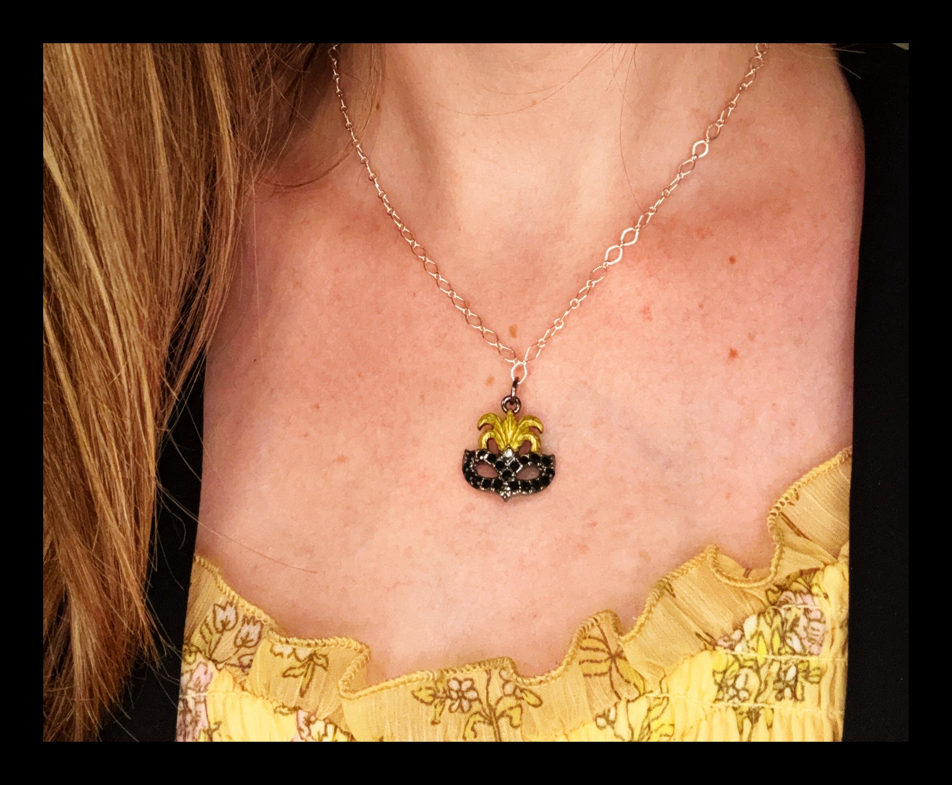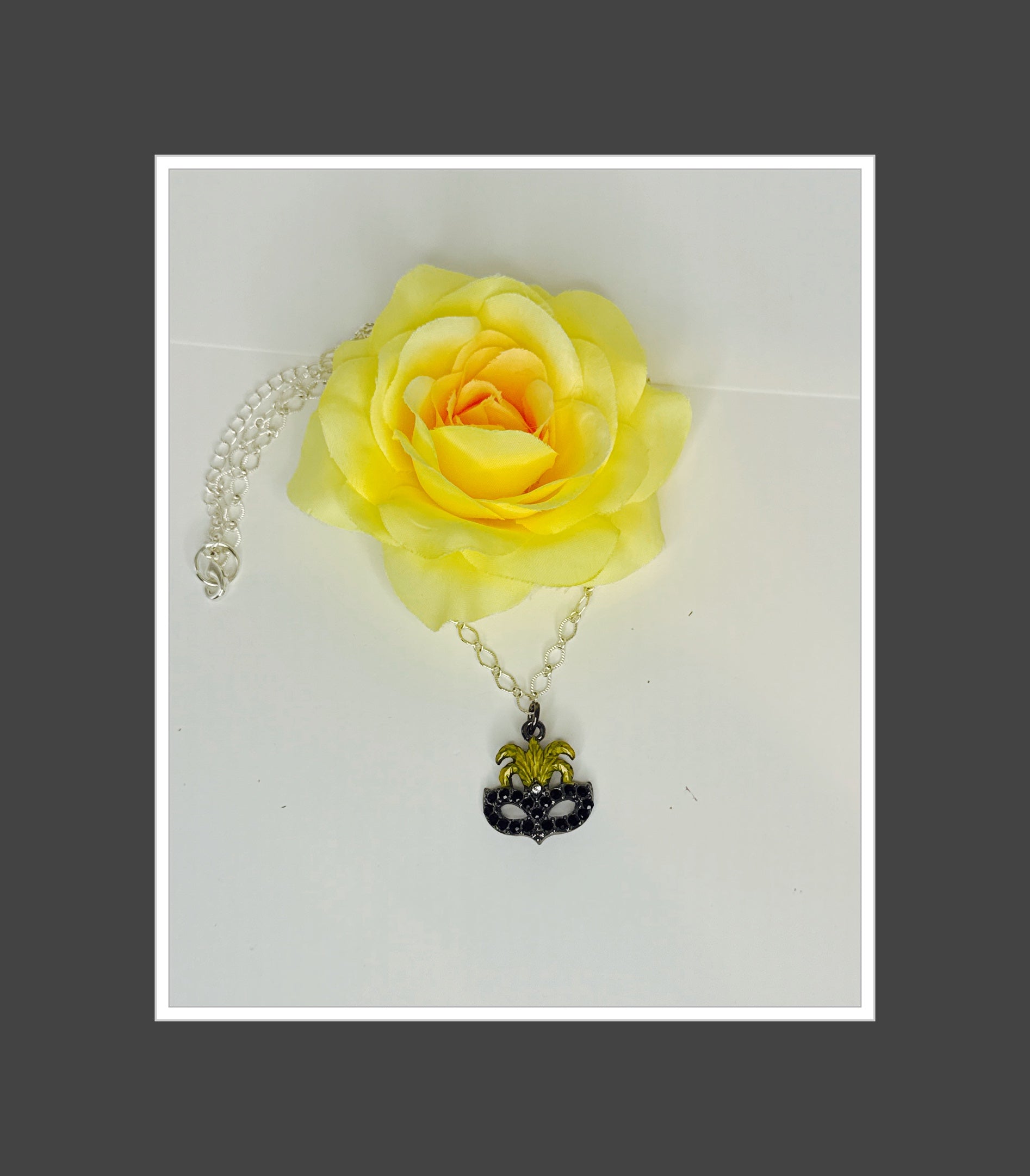 The necklace features a pendant of a mask, beautifully colored in black and gold, capturing the mysterious essence of Mardi Gras season.