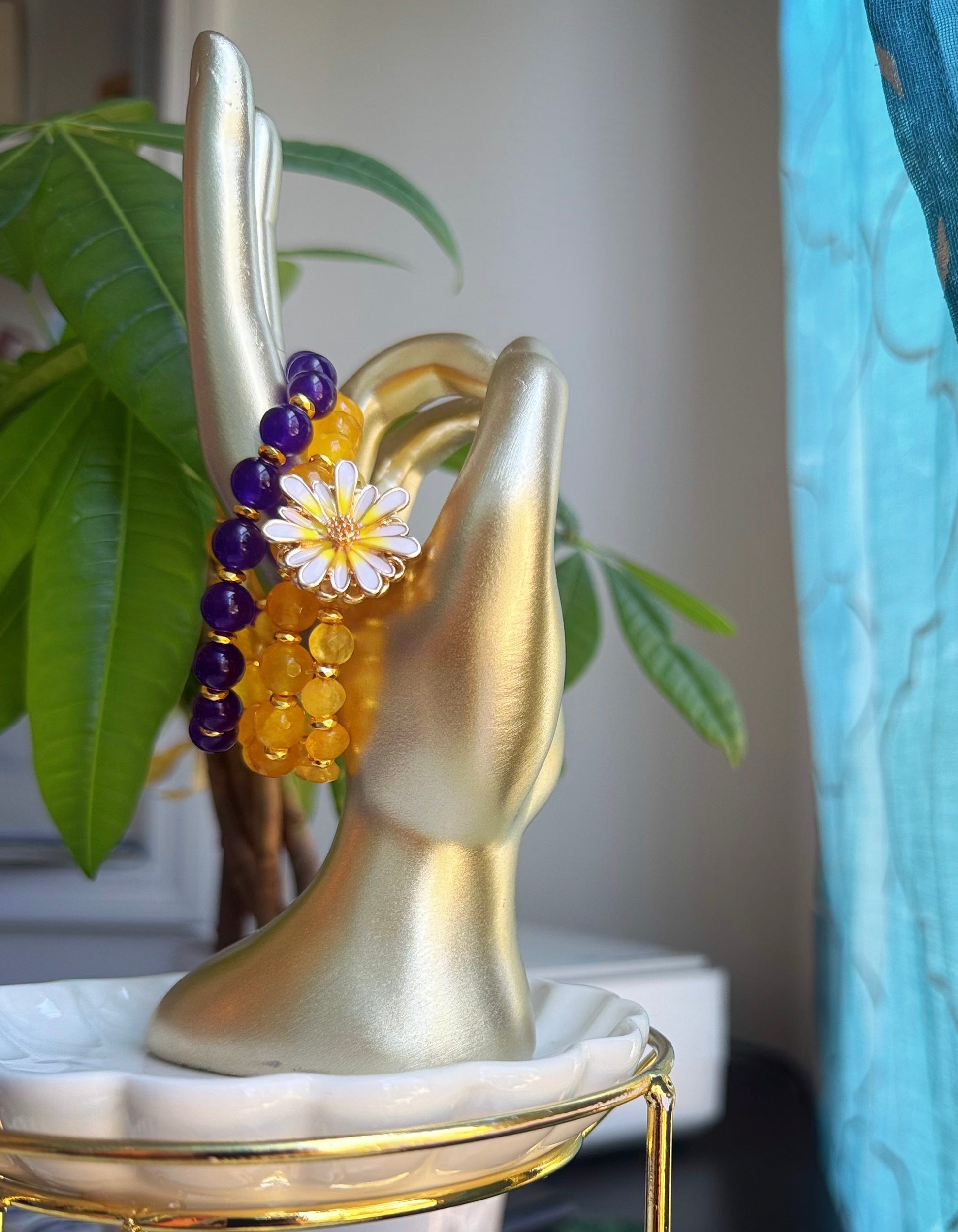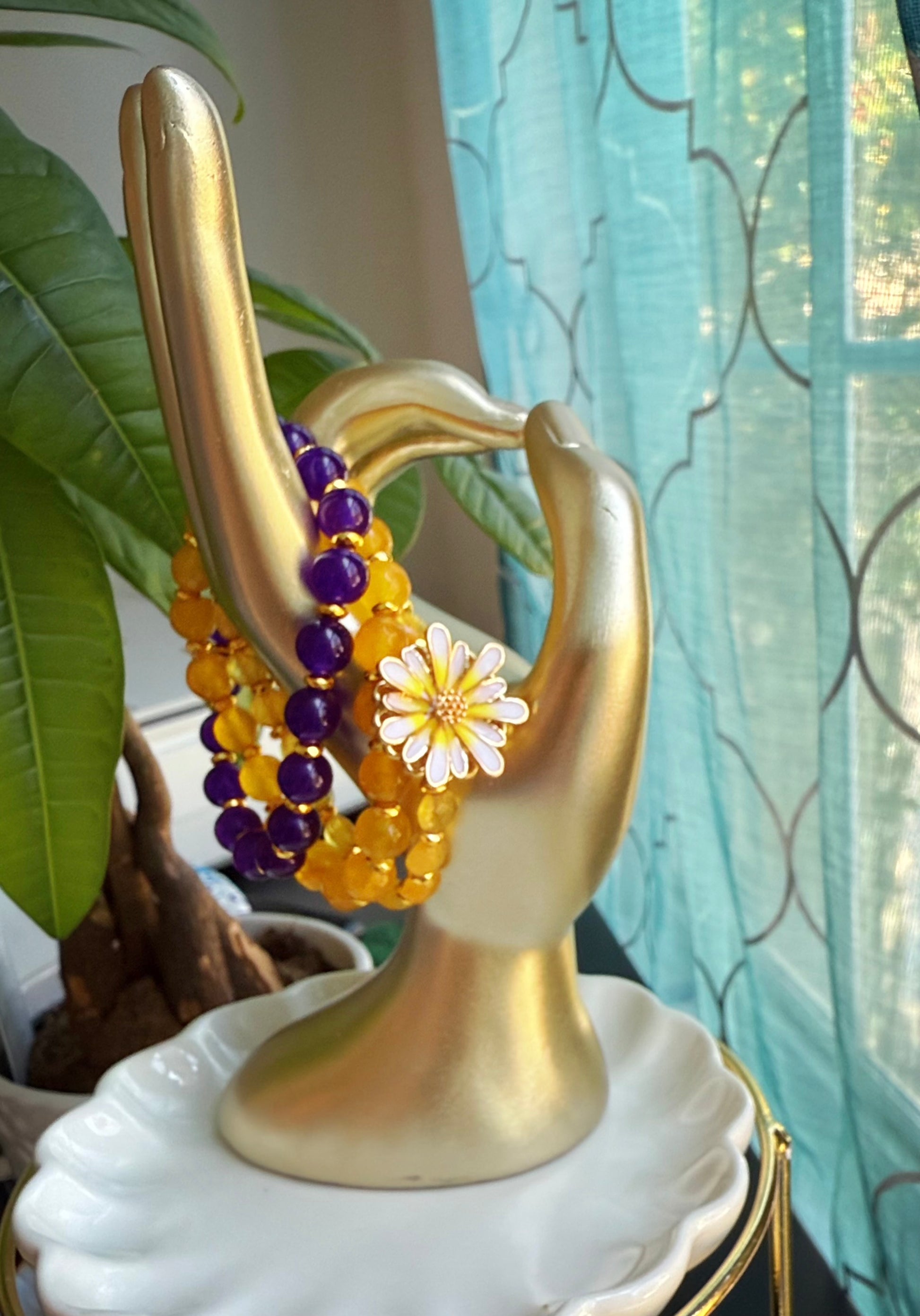 Paired with the citrine beads are dyed purple and yellow jade stones, a timeless symbol of harmony, protection, and prosperity. Jade is revered for its calming influence and is thought to bring balance and luck to its wearer. Together, these stones create a perfect blend of uplifting energy and serenity.