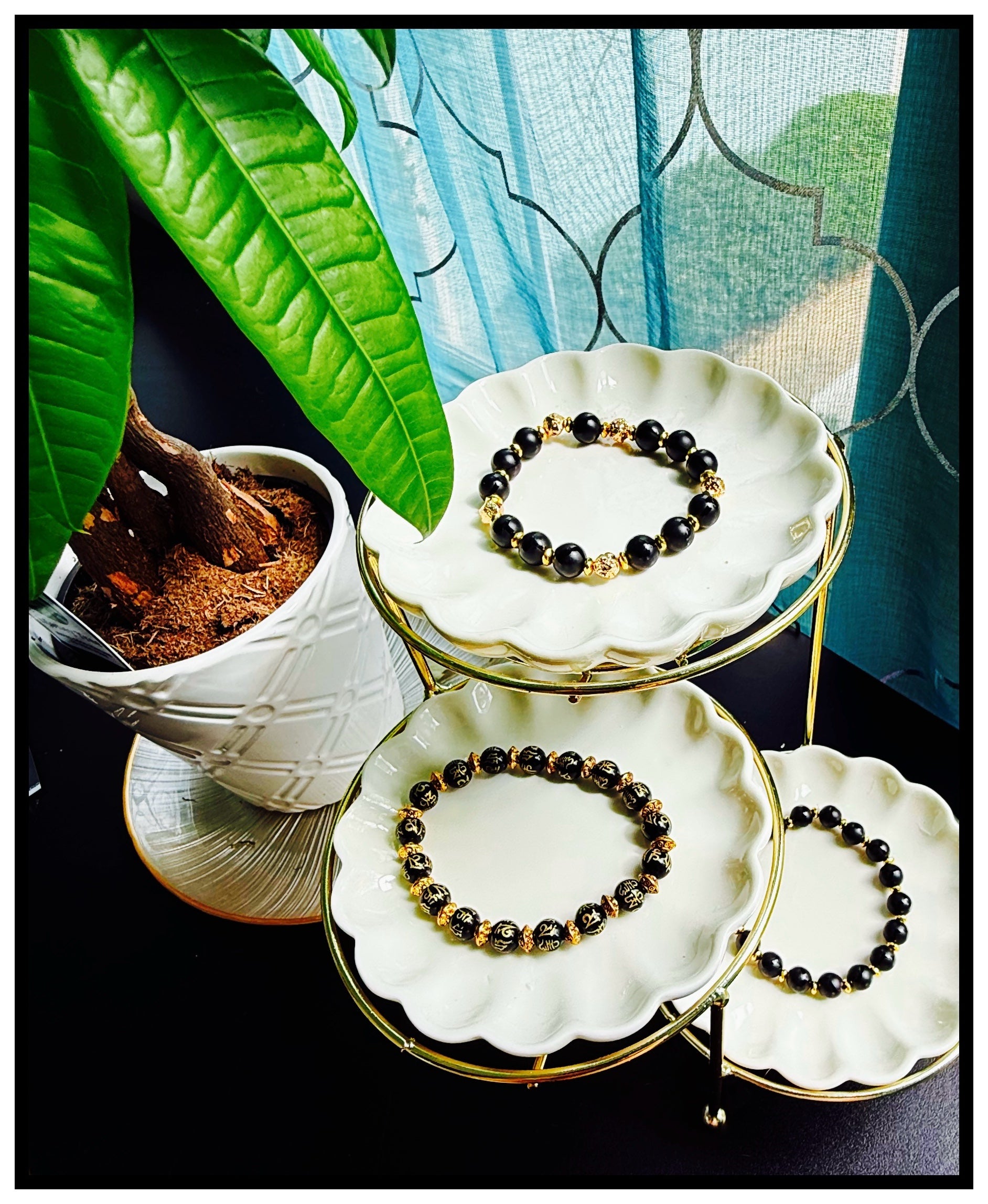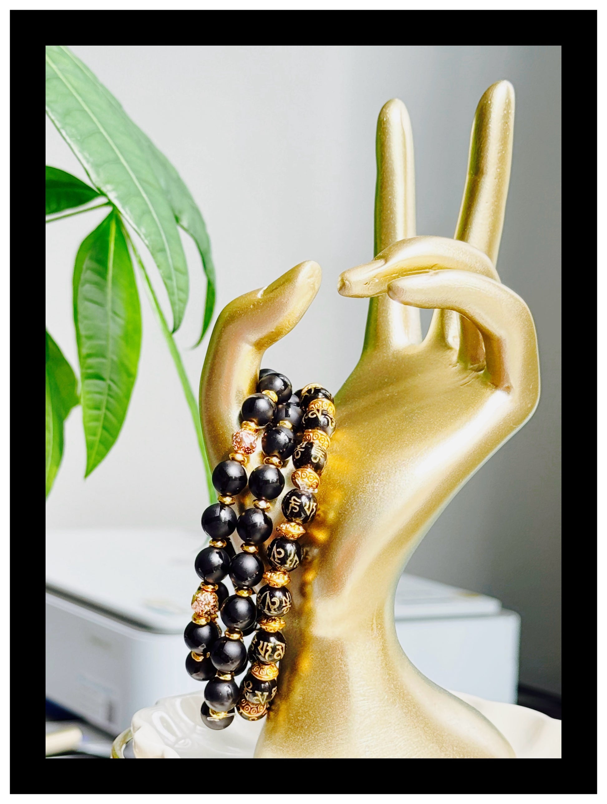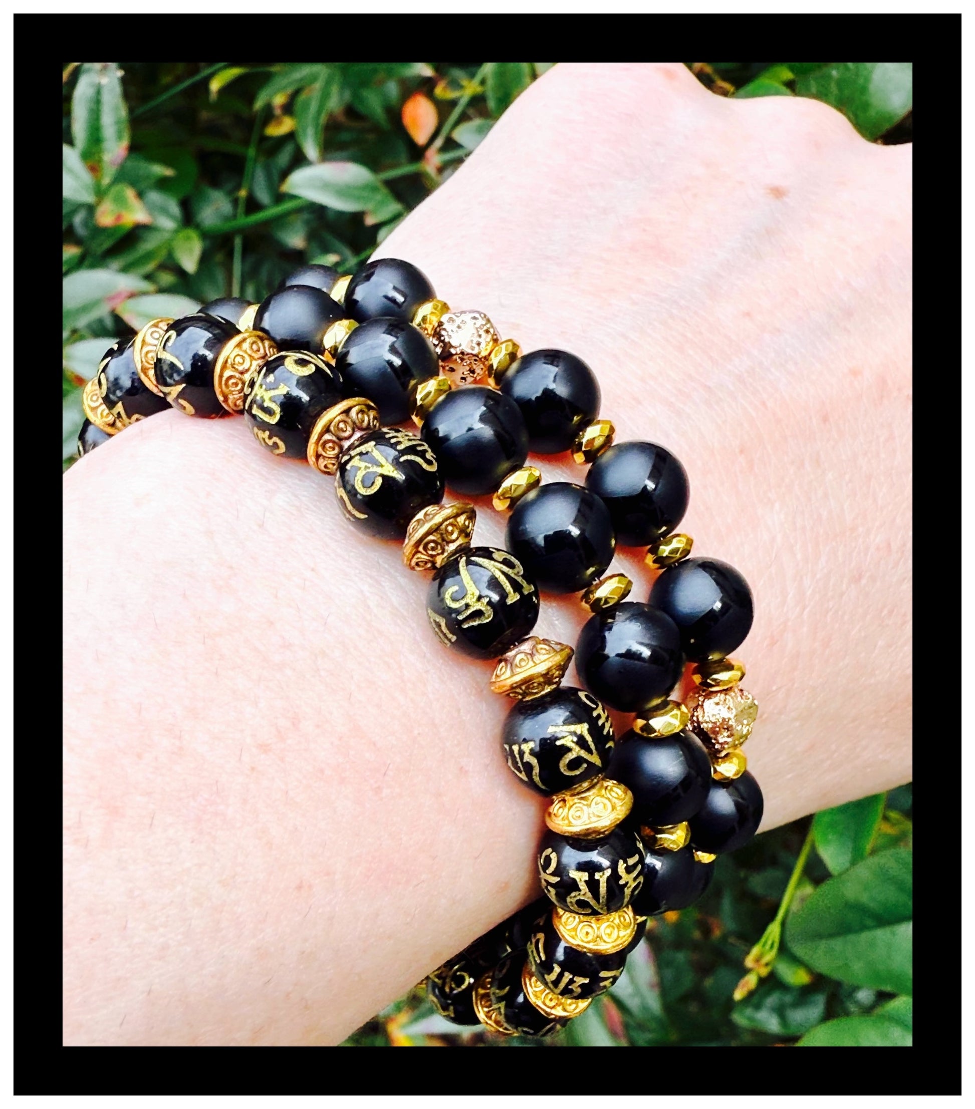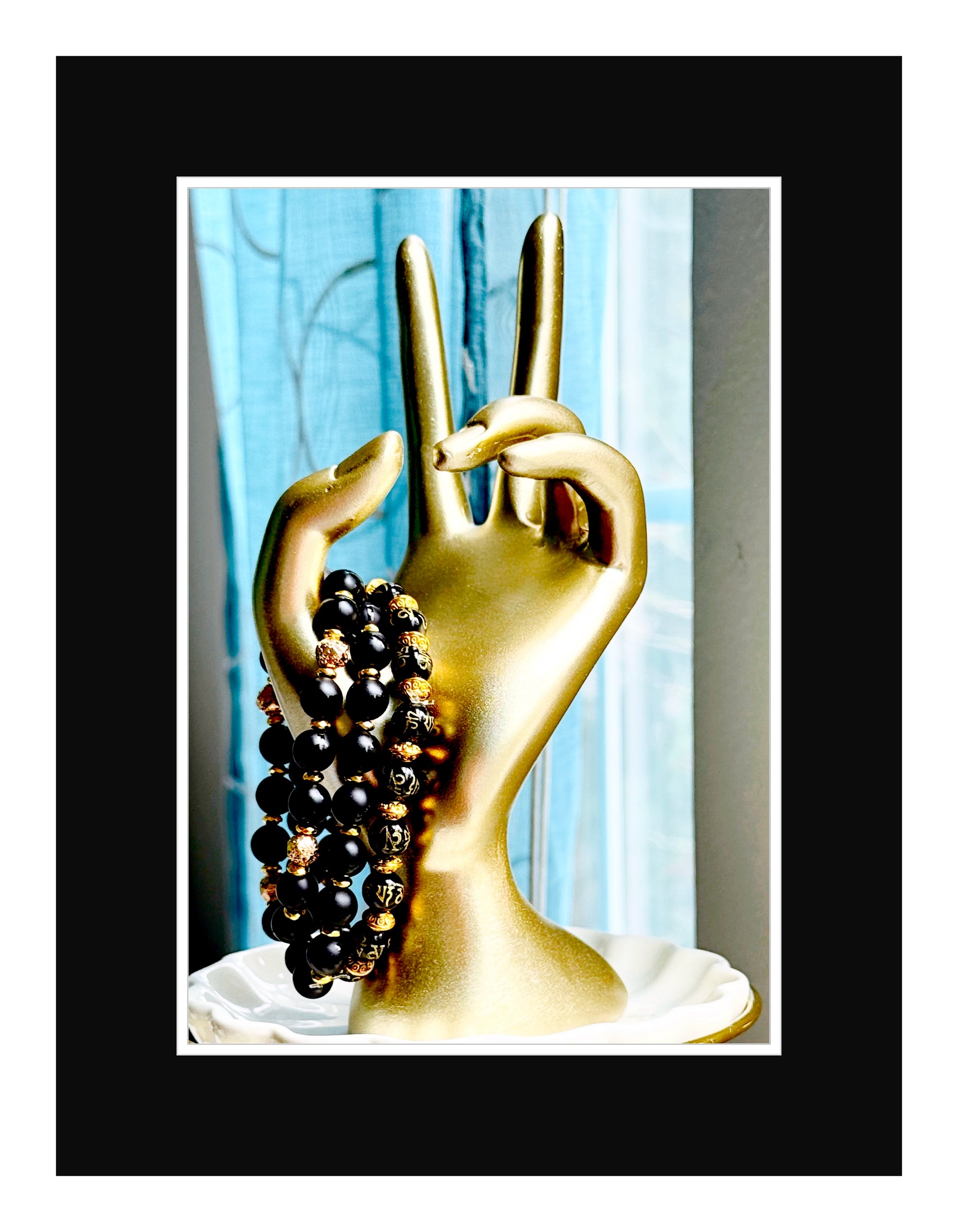 This set features black onyx beads, Tibetan etched for added character, radiating confidence and strength. Onyx, a stone revered for its grounding and protective properties, is believed to enhance emotional resilience and self-mastery, empowering those who wear it.