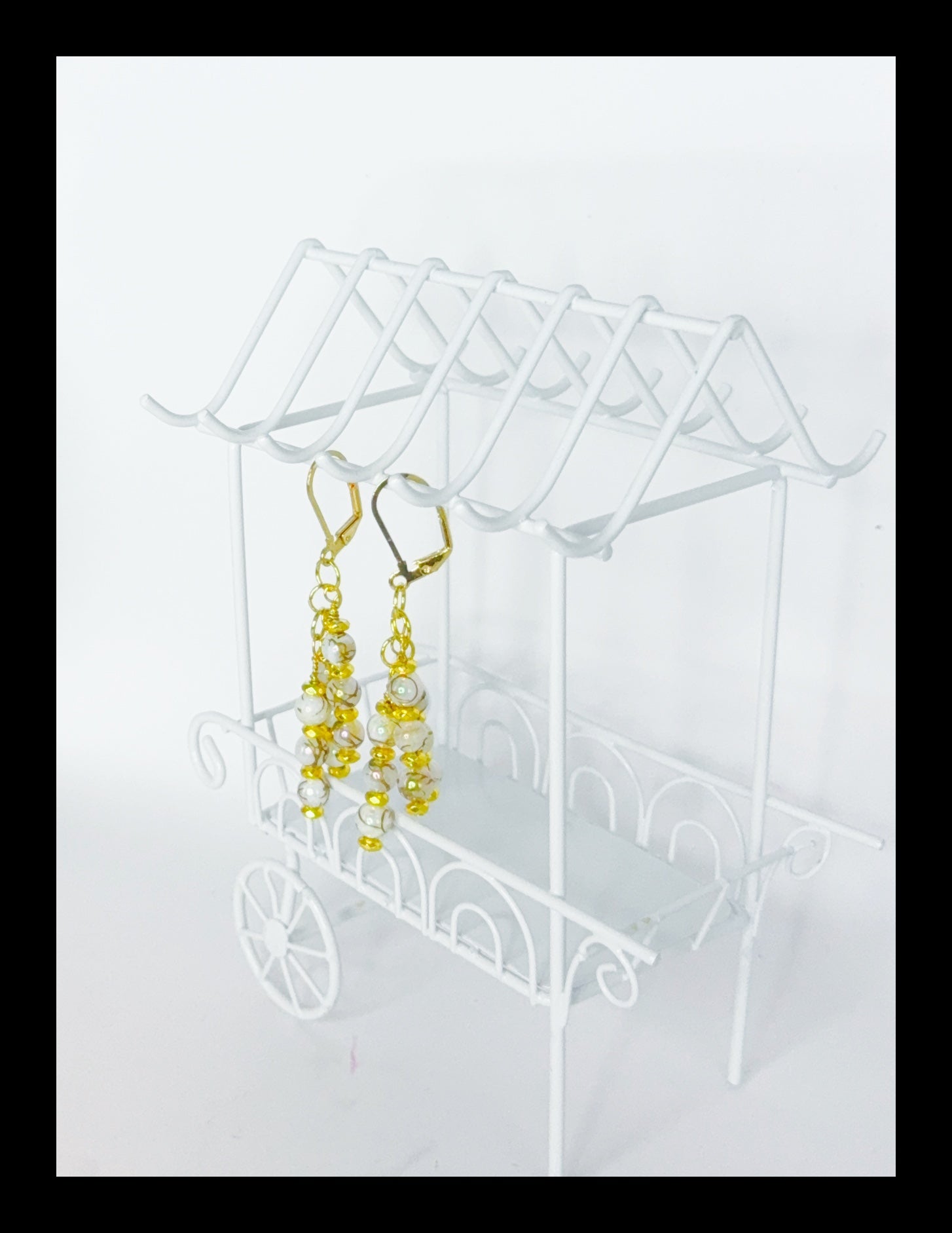 These exquisite earrings feature seashell beads painted with delicate golden highlights, complemented by gold-plated hematite spacers that add a touch of sophistication.