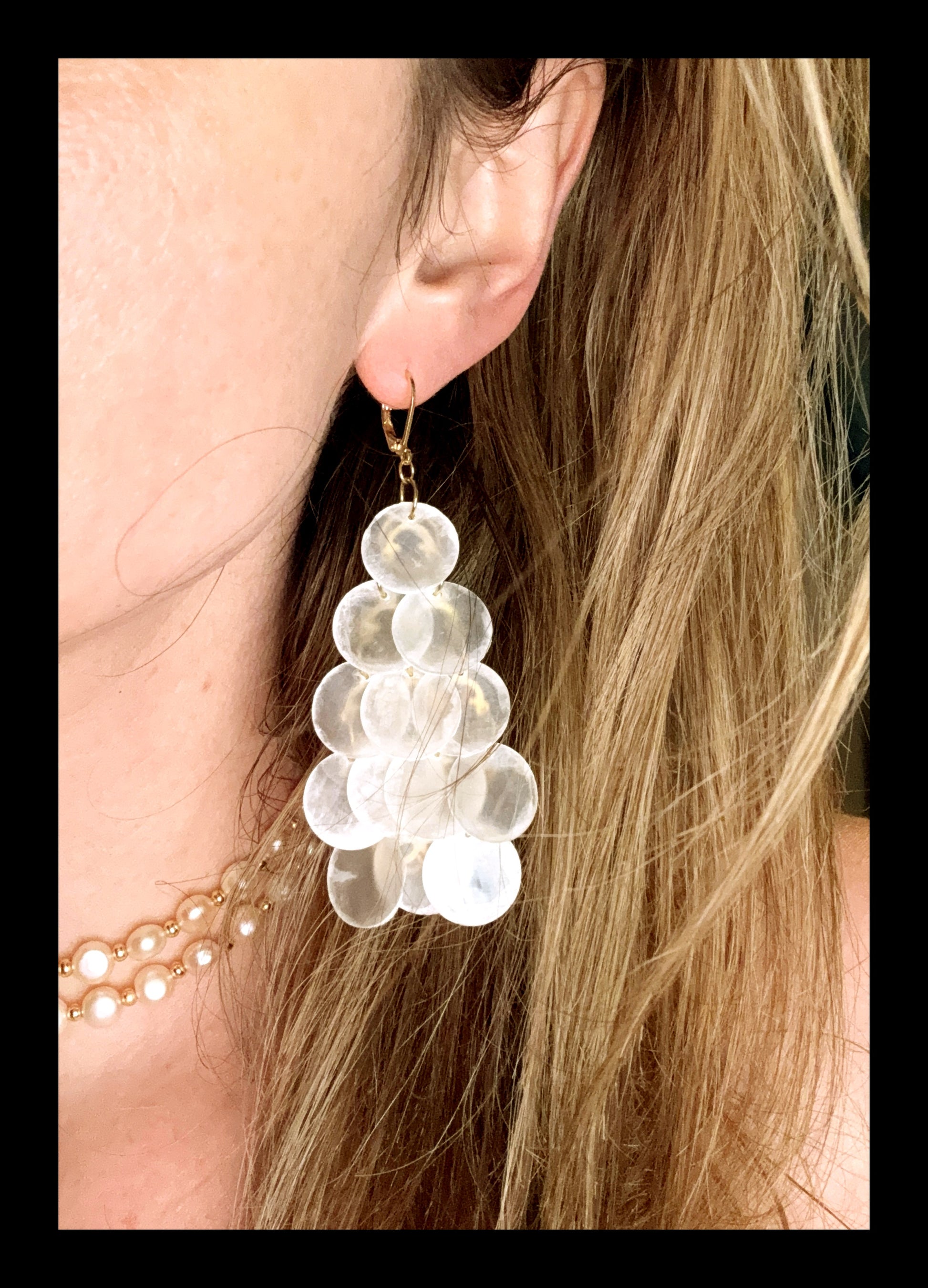 These striking earrings are crafted from an intricate lattice of Capiz seashells, each piece meticulously arranged to create a captivating visual effect with every turn of the head.