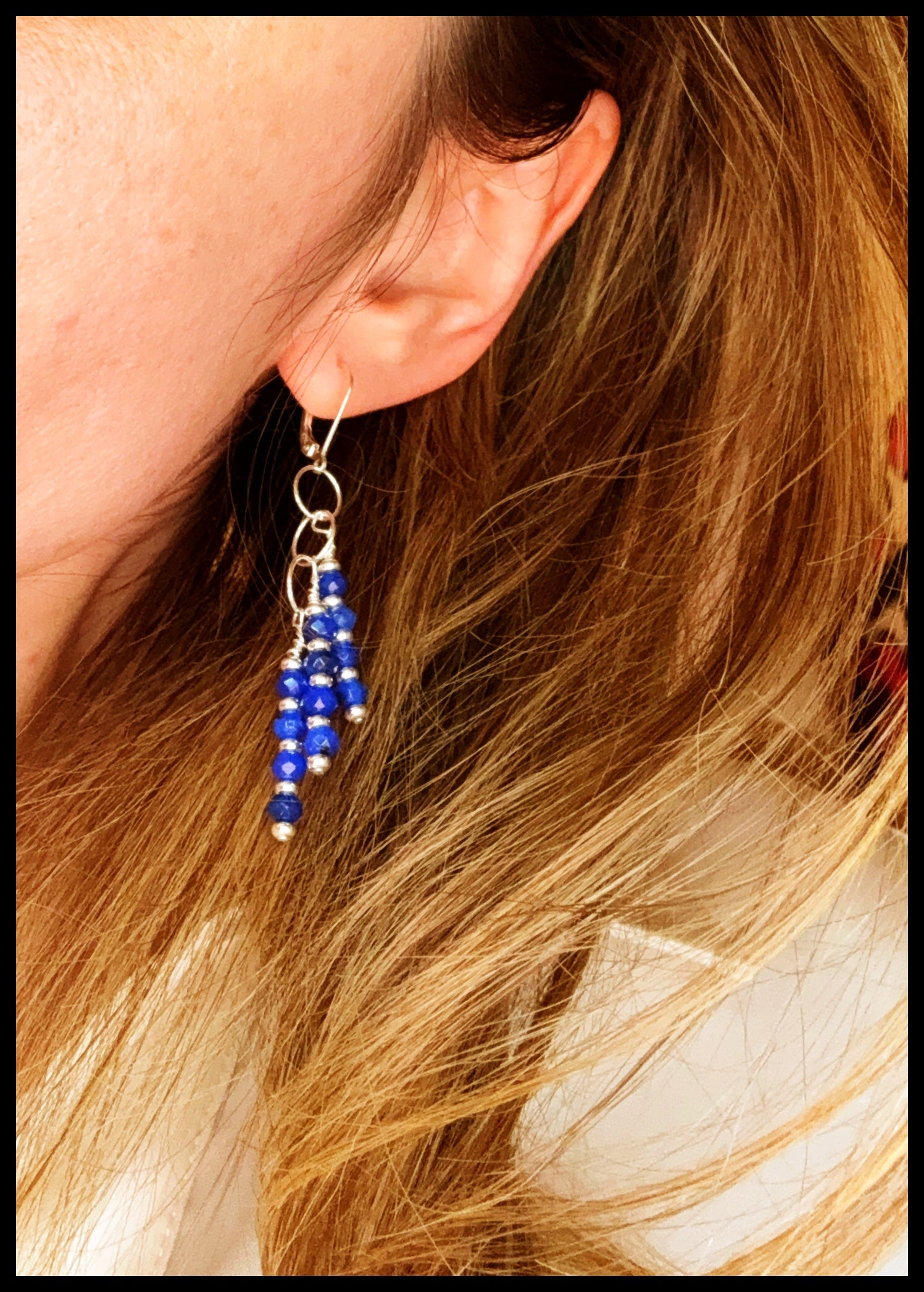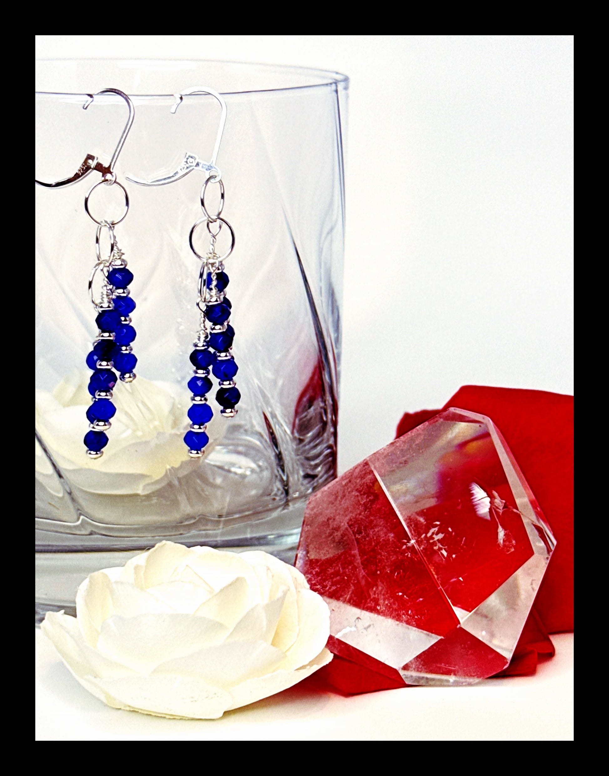 This breathtaking piece exudes elegance and poise. The earrings feature brilliant faceted sapphires, known for their deep and mesmerizing blue hue, paired with sterling silver and arranged in a chandelier style, creating a timeless and graceful look.