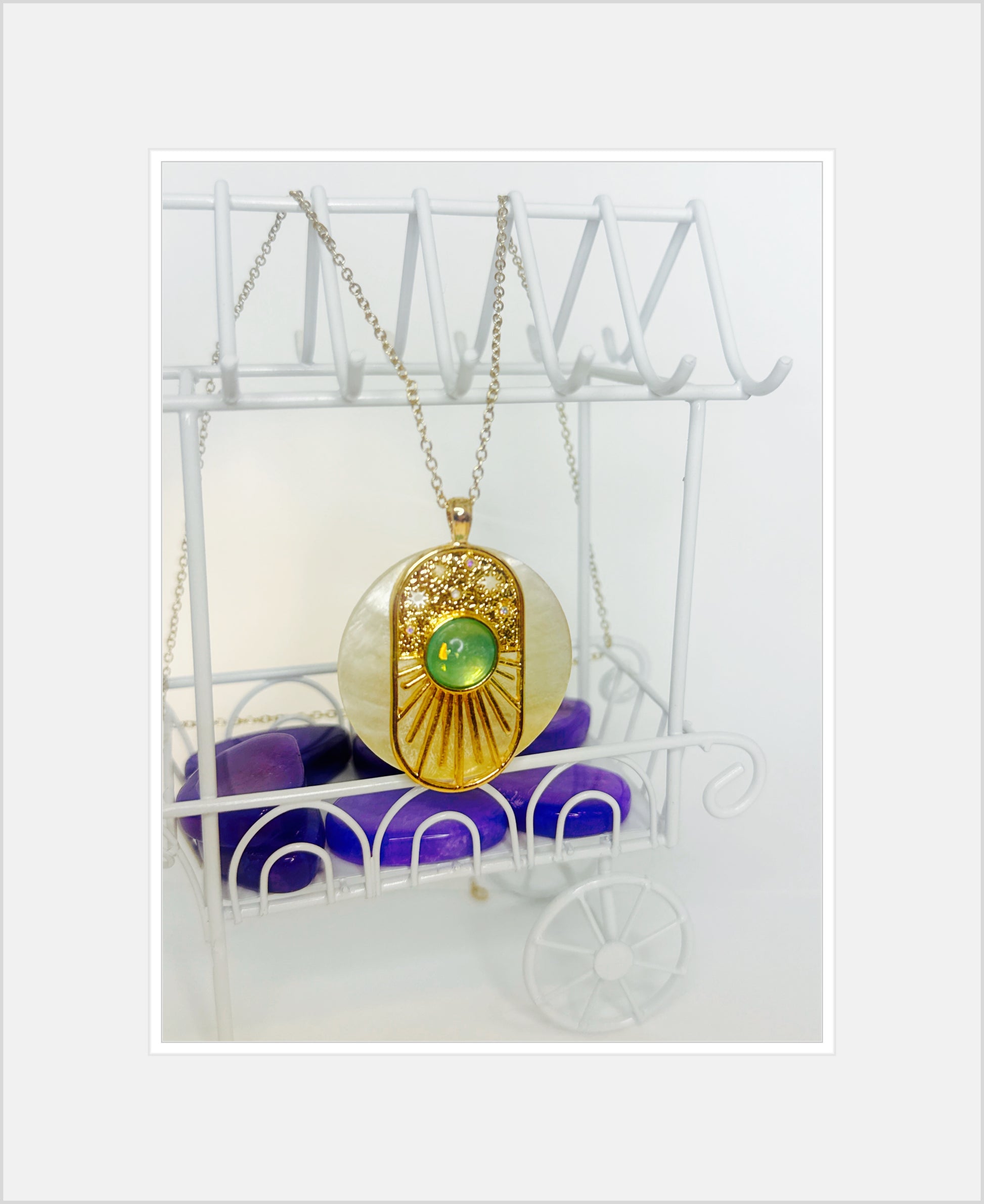 The nymph used the stone to create a necklace that would forever hold the sun's warm embrace. She surrounded the stone with a golden pendant, with golden rays extending outward from the stone, as if the sun itself were reaching out to touch the world.