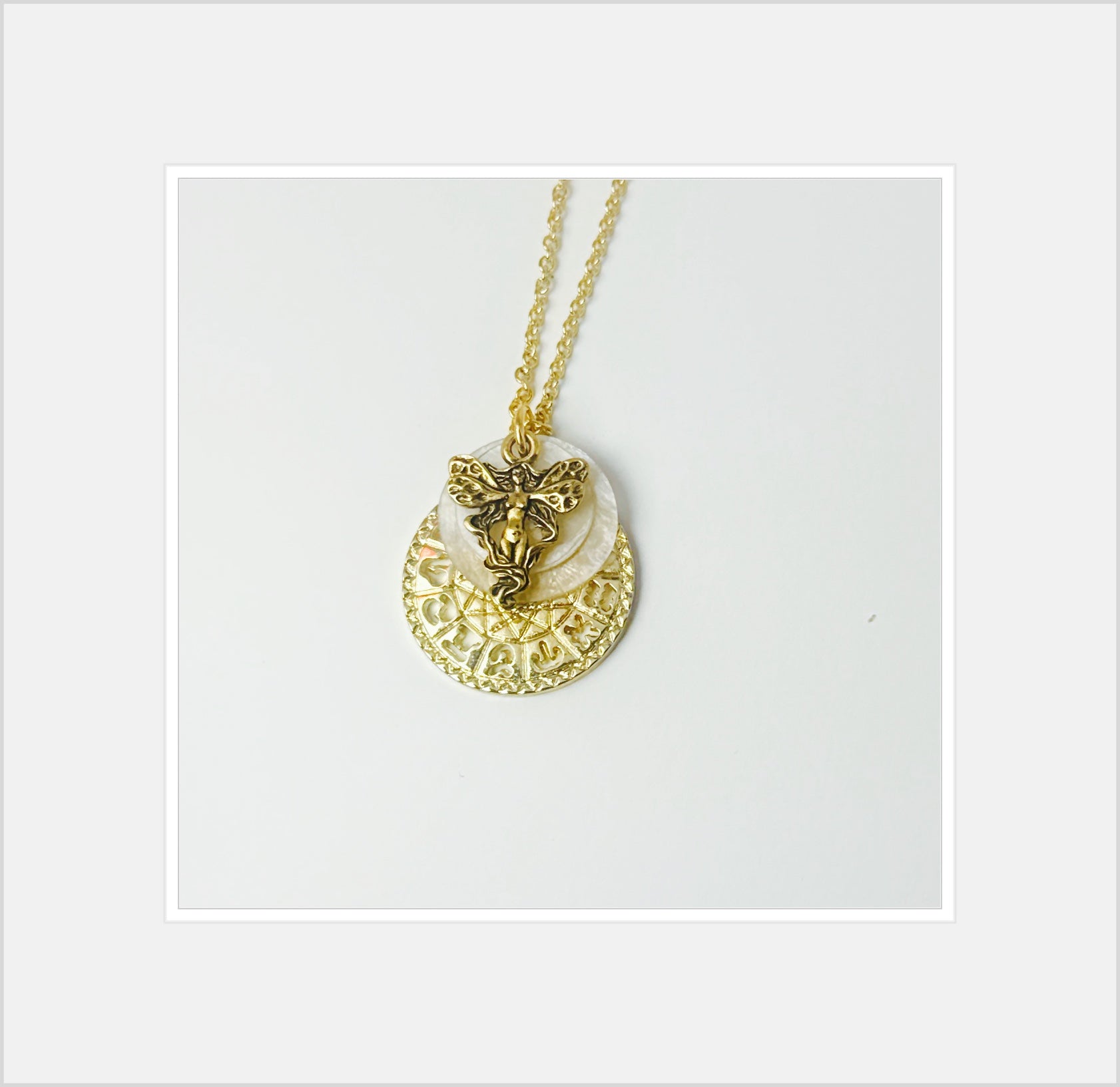 The pendant hangs gracefully on a gold-plated chain, completing the look with a touch of timeless sophistication.