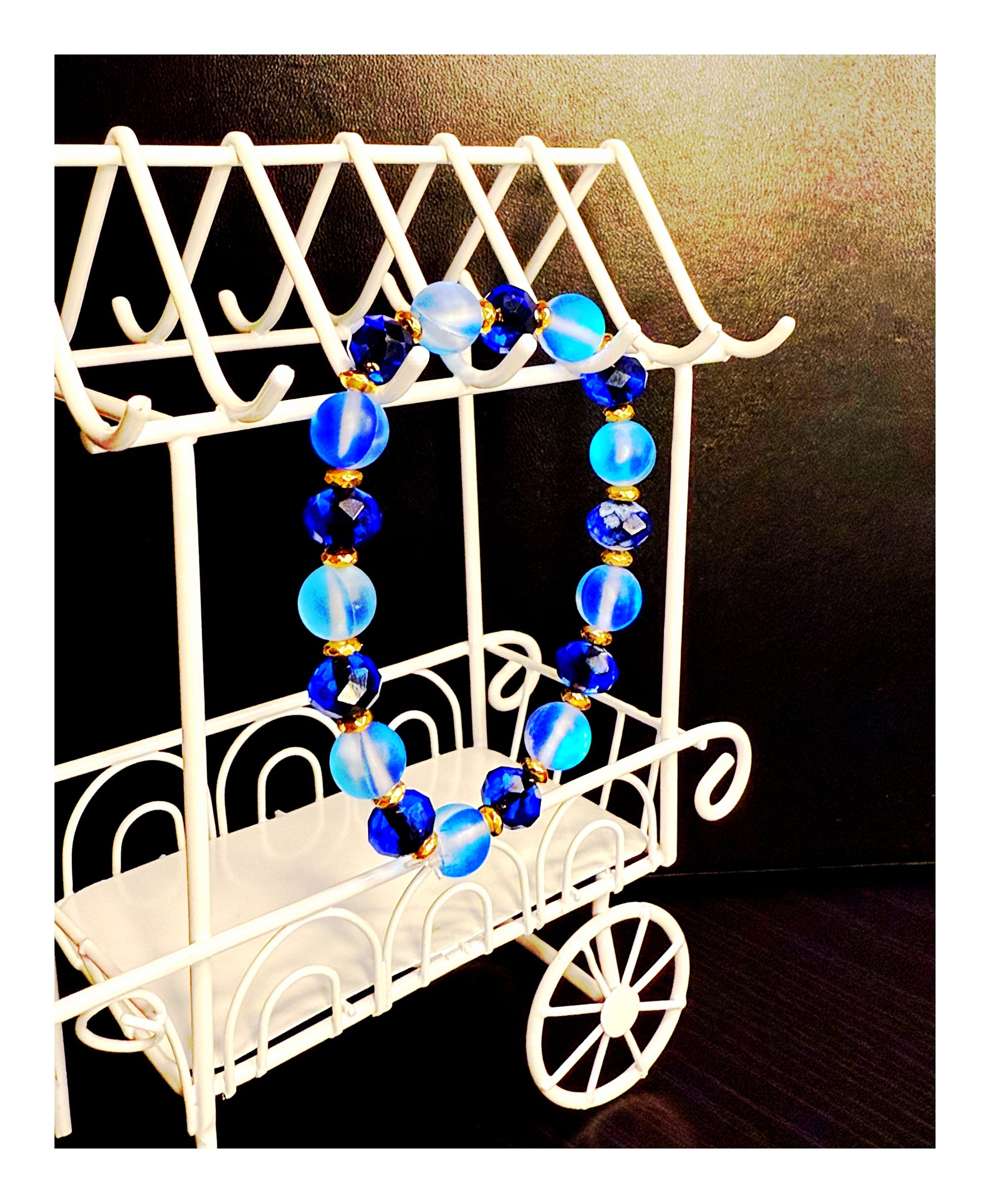 Deeper blue glass beads enhance contrast, adding richness and depth to the bracelet’s composition, evoking the vastness of the ocean or the serenity of twilight skies.