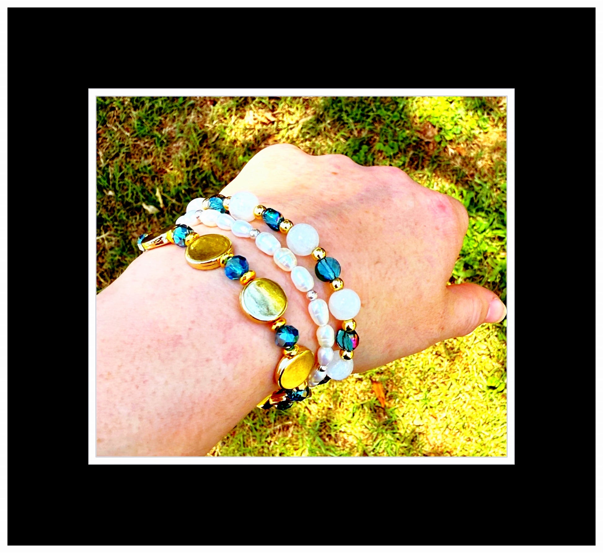 The final bracelet ties the set together with rich blur accent beads and elegant golden coin-shaped beads, adding warmth and sophistication. The golden elements enhance the luminous qualities of both pearl and moonstone, bringing a sense of completeness and refined grace.