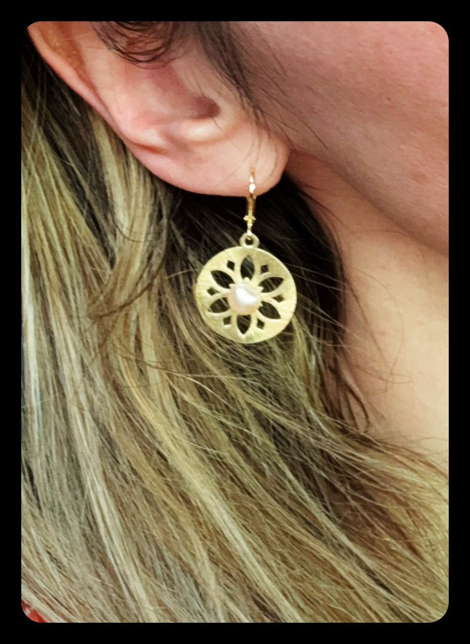 It features a matching necklace and earrings each featuring a single luminous pearl set against a beautifully crafted golden backdrop, embodying sophistication and simplicity.