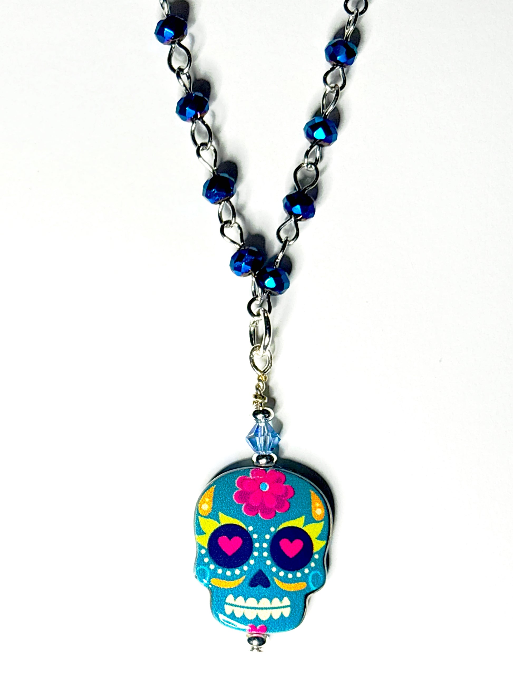 This striking necklace is a fusion of vibrant energy and grounded strength, featuring a colorful skull on a chain interspersed either blue glass beads.