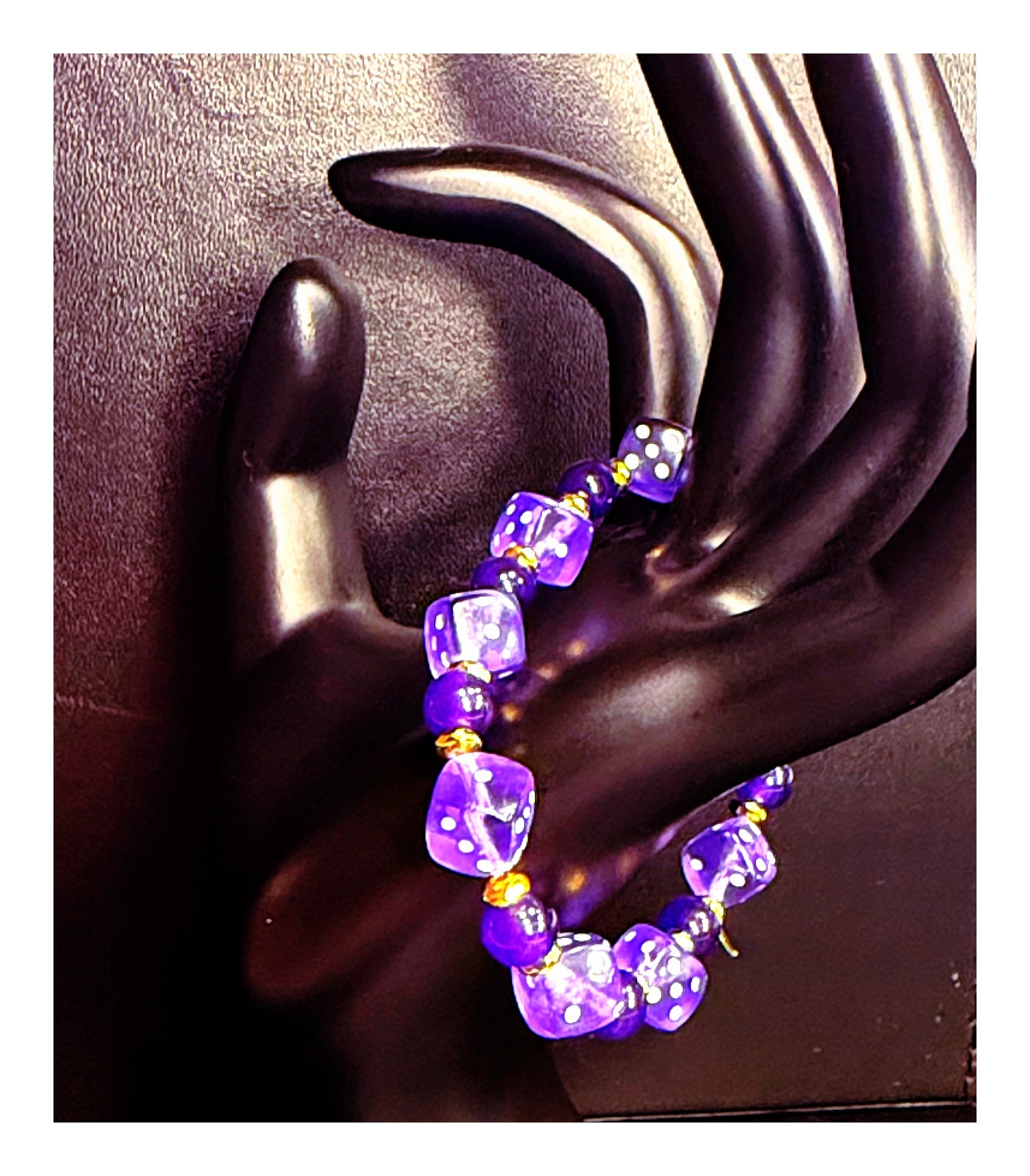 The purple dice evoking the thrill of unpredictability and the excitement of new opportunities. Purple Jade Stones are interspersed throughout, which bring a sense of wisdom, spiritual insight, and protection. In crystal lore, purple jade is associated with intuition, serenity, and transformation, making it a powerful stone for those seeking clarity and inner strength.