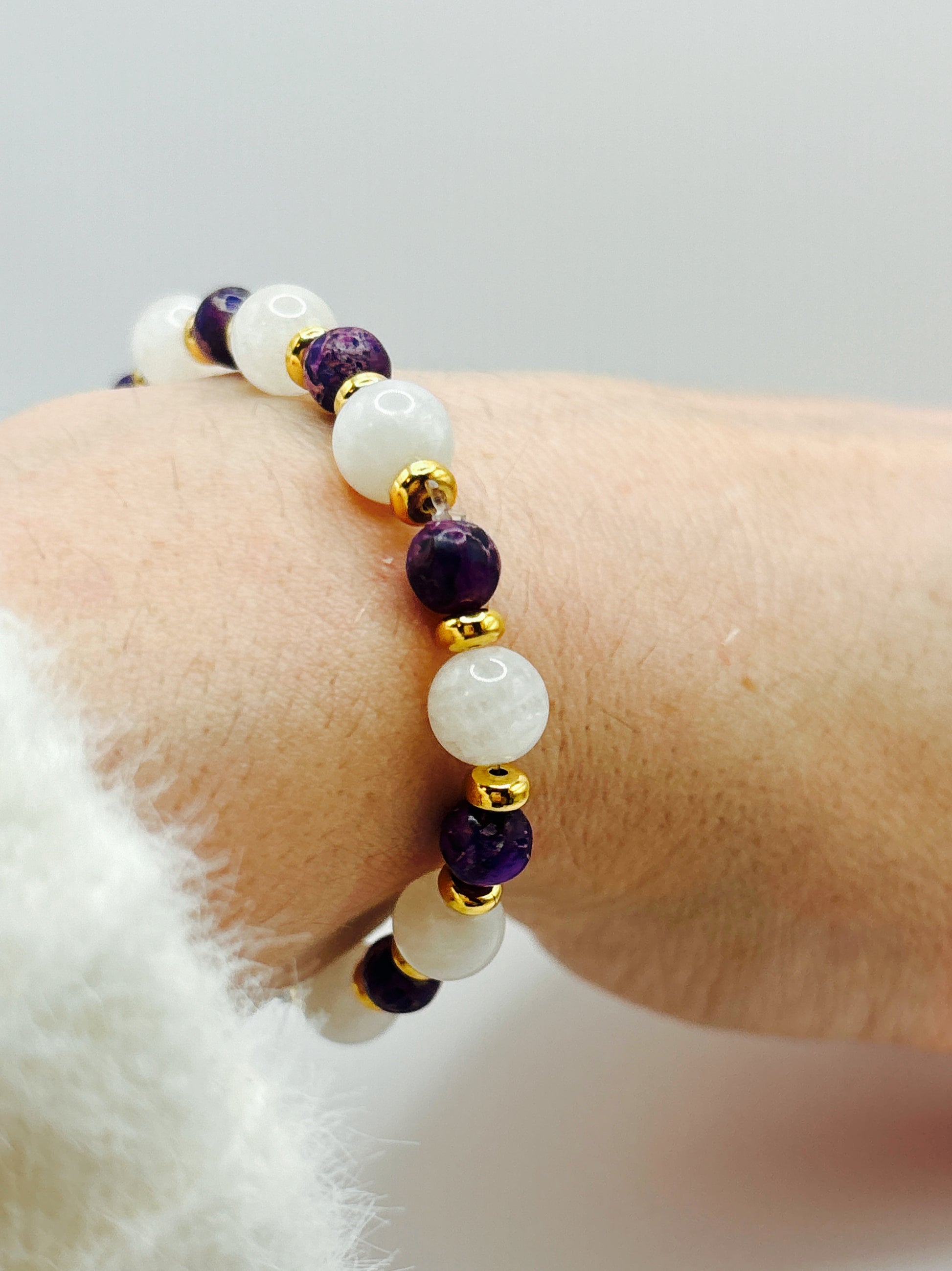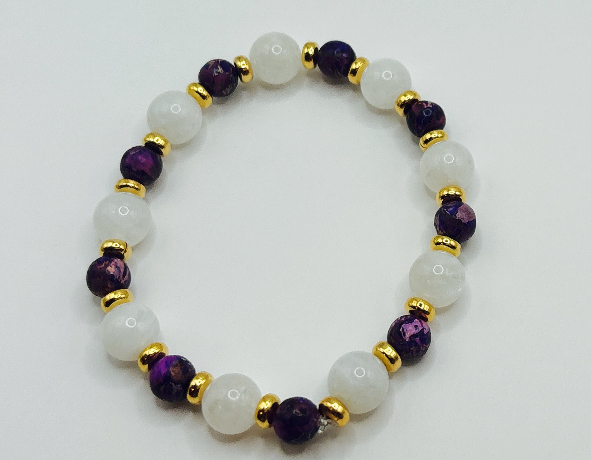 This bracelet features the vibrant hues of purple dyed jade, known for its protective and healing properties, paired with the ethereal glow of moonstone, which promotes balance and intuition.