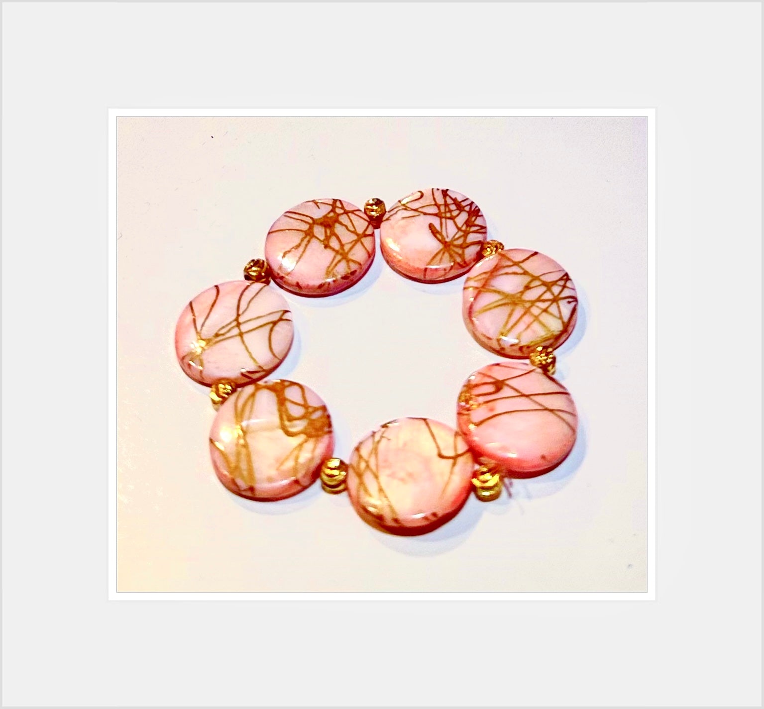 Each round seashell, delicately painted in blush pink and radiant gold, evokes the warmth of twilight reflecting off ocean waves.