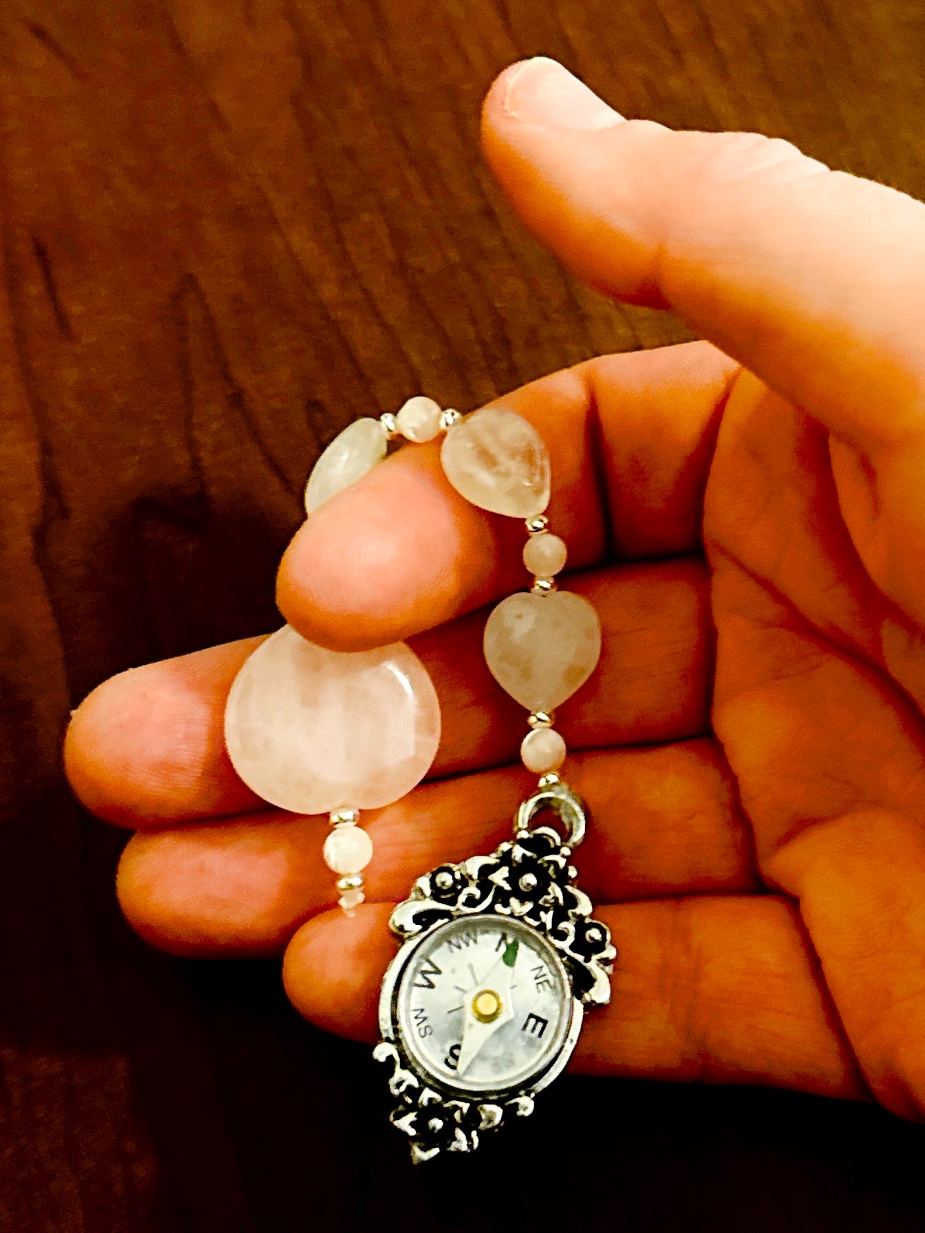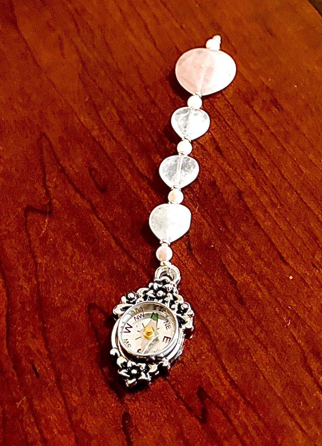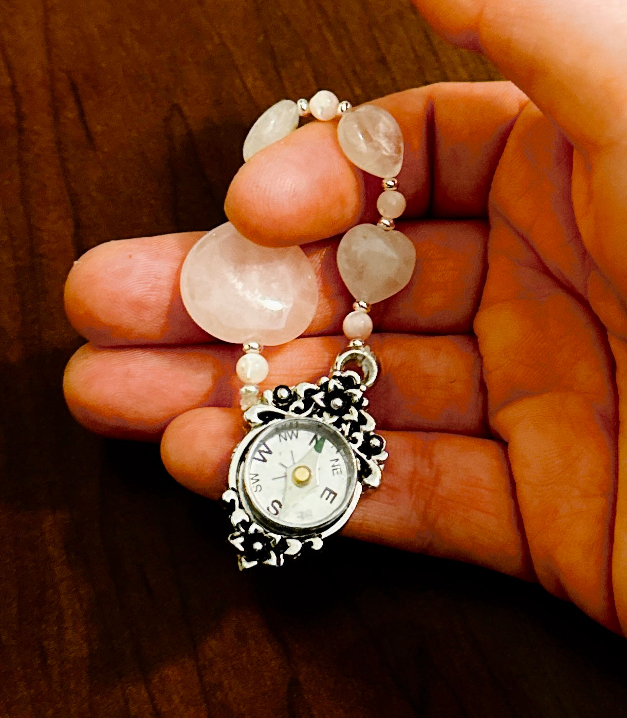 This exquisite piece features a fully functional handheld compass, beautifully attached to a chain adorned with rose quartz beads, known for their loving and healing properties.